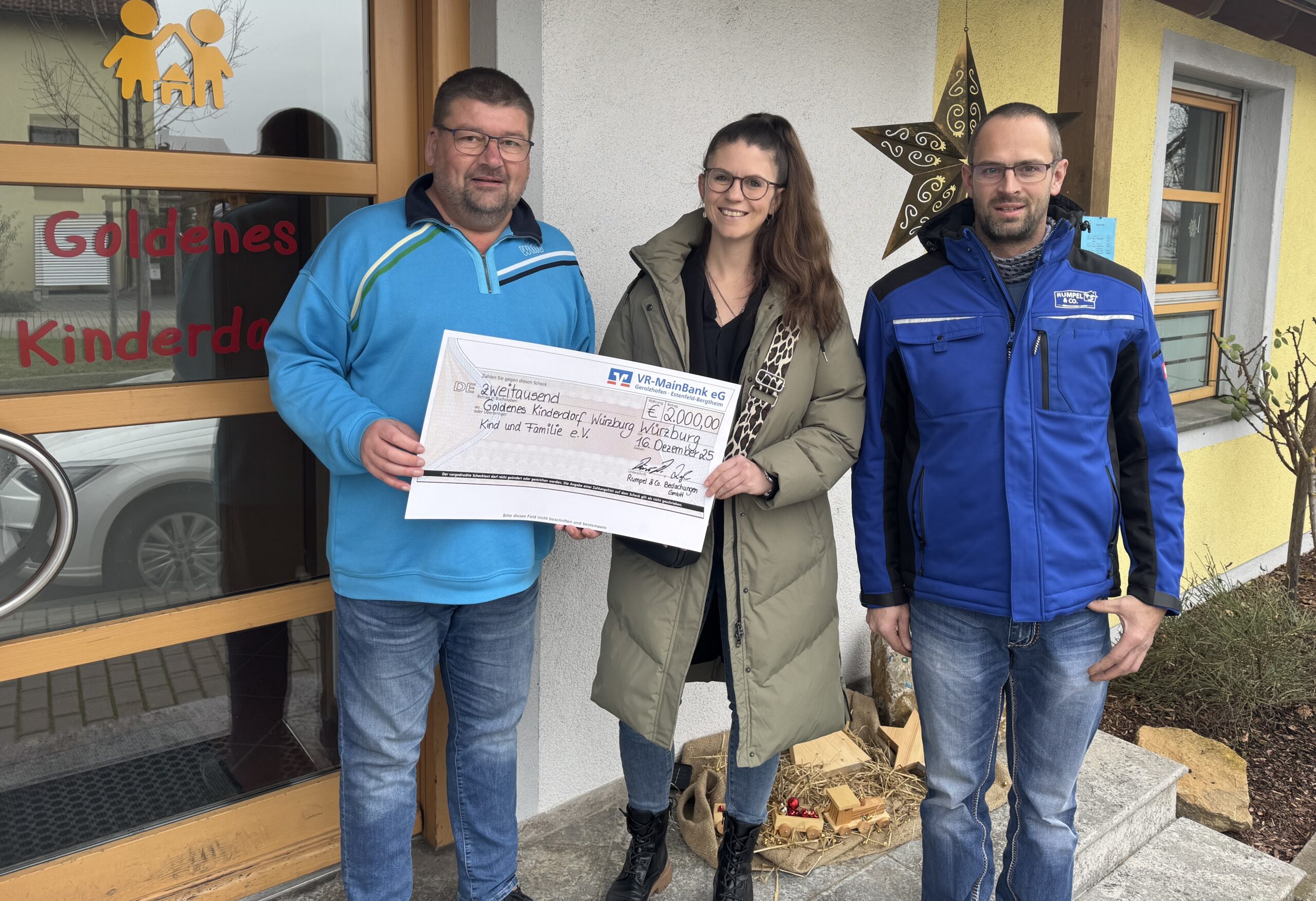 Würzburg, 16.12.2025. Große Freude im Goldenen Kinderdorf: Bianca Ziegler und Daniel Dürr, beide Geschäftsführer der Rumpel & Co. Bedachungen GmbH aus Opferbaum, haben einen symbolischen Scheck in Höhe von 2.000
